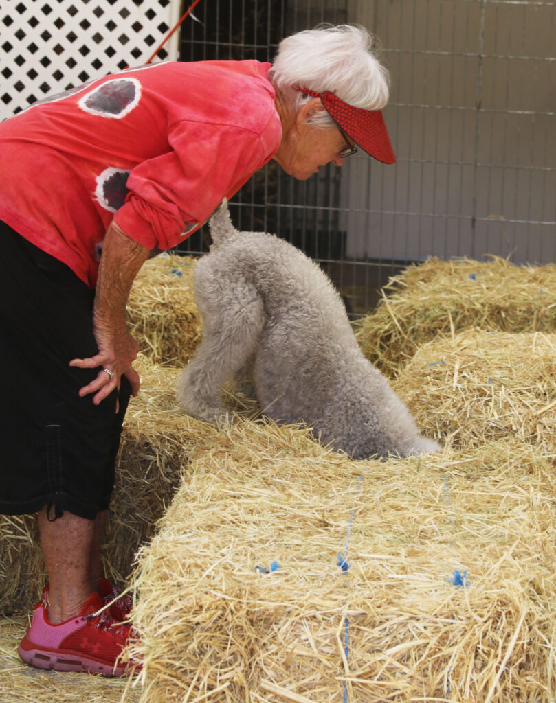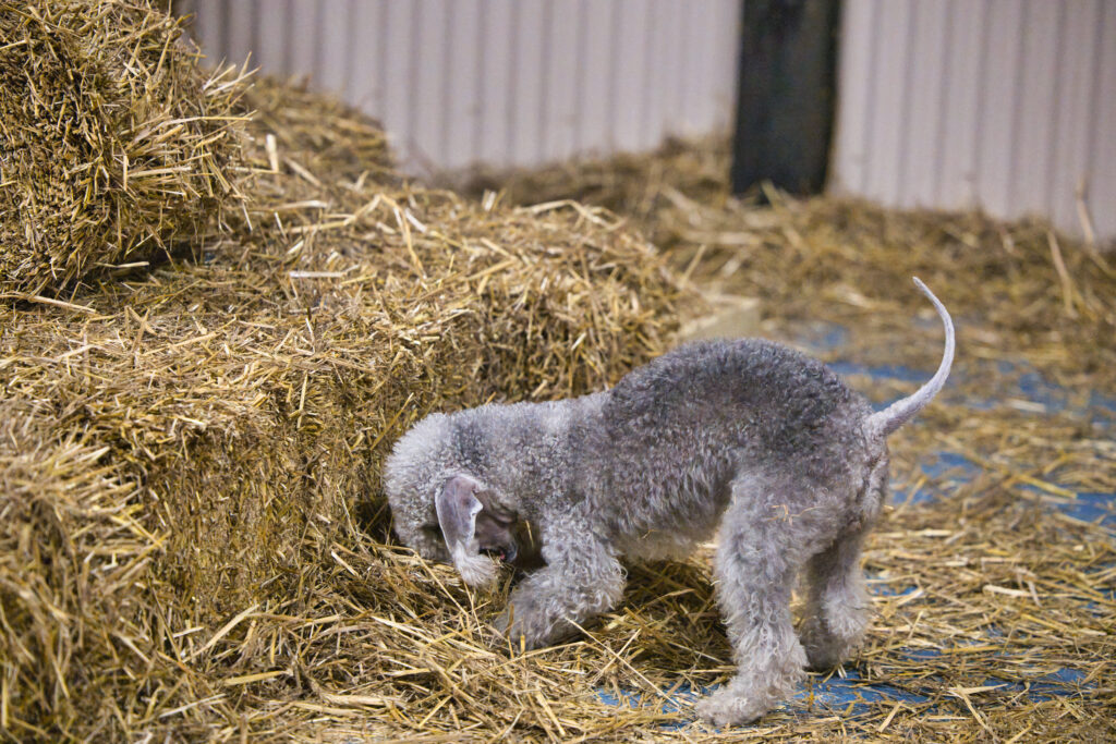 Barn Hunt is an organized sport where dogs and handler work as a team to locate and mark live rats hidden in a maze of straw or hay bales. The reats are safely held in aerated containers to avoid injury or harm. Barn Hunt tests the nose, speed, agility, and surefootedness of dogs that have a history of above-ground vermin hunting according to the Barn Hunt Association founder, Robin Nuttall. Perfect for the Bedlington Terrier who was bred to hunt rats! Barn Hunt events include pass/fail instinct class for owners who want to familiarize their dogs with the test. Courses are made increasingly difficult by adding more obstacles, additional diversions, and more rats to locate. There are several types of Barn Hunt titles your dog can earn: